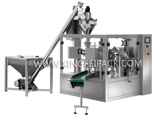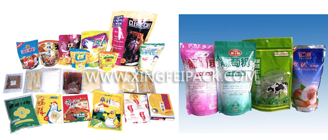 旋轉(zhuǎn)式給袋式自動包裝機(jī)適用于平面袋,自立袋,拉鏈袋等各種形狀的熱封的復(fù)合袋.